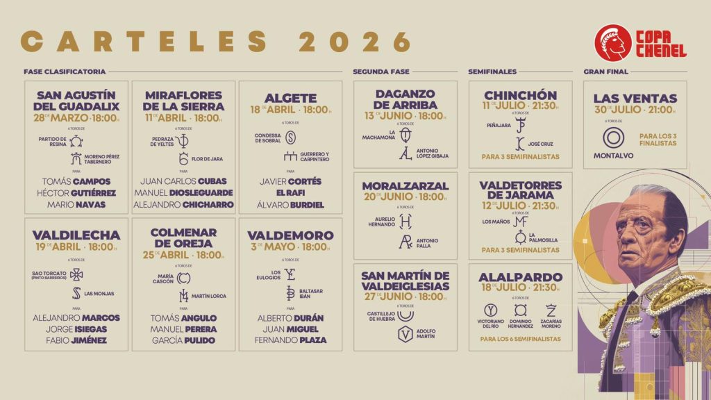 Esta edición de la Copa Chenel contará con 18 matadores de toros, llegados desde España, México, Perú y Francia; un total de 26 las ganaderías que lidiarán en 13 localidades distintas entre el 28 de marzo y el 30 de julio.